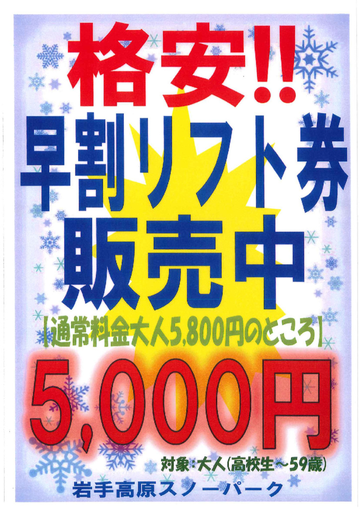 10月1日より「早割リフト1日券」販売! 日頃より岩手高原スノーパークをご愛顧いただき、誠にありがとうございます。 10月1日より2025-26シーズン中にいつでも使える お得な「早割リフト1日券」の販売を開始いたします! 通常価格5,……